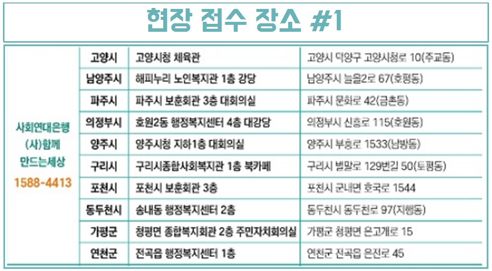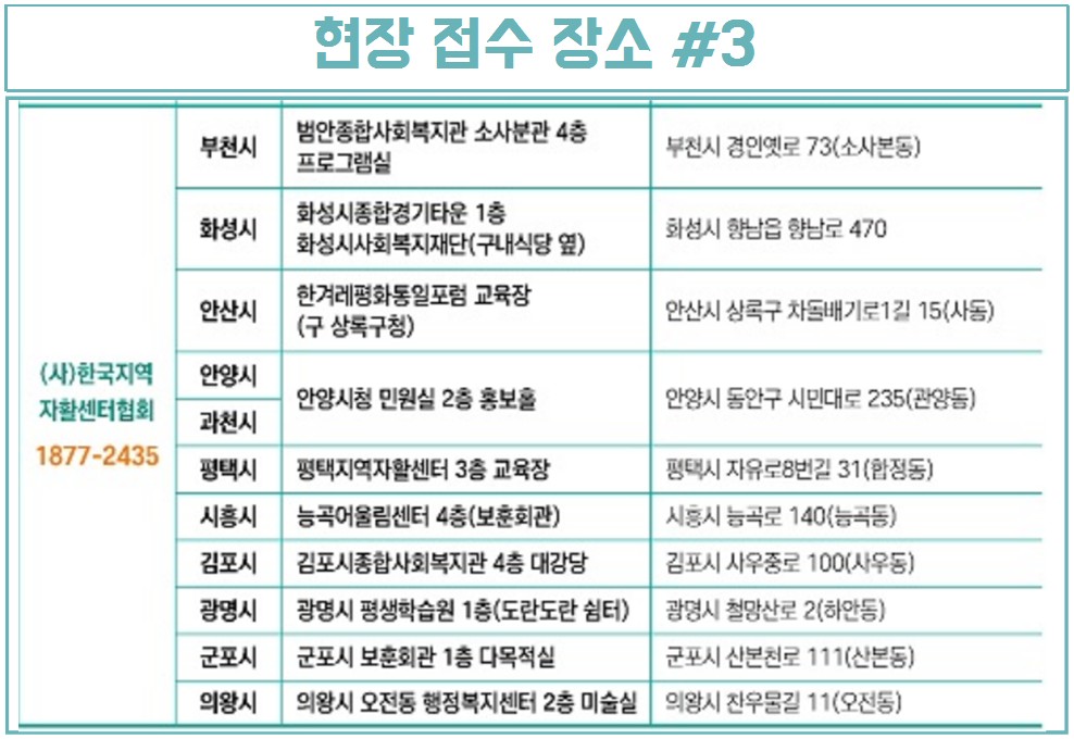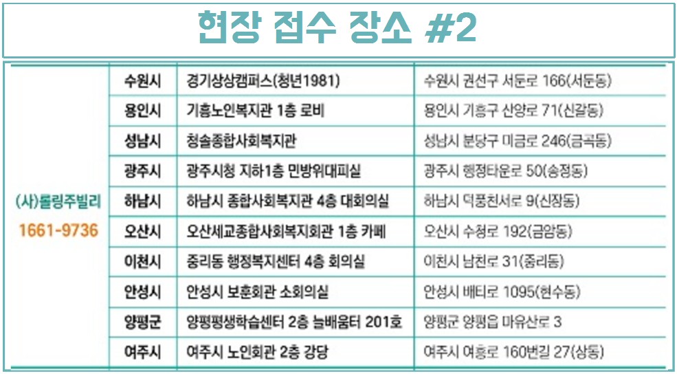 신청방법은 온라인은 불가하며, 경기도의 지역별 신청장소에 직접 방문하셔서 신청하셔야 합니다. 접수기간과 시간을 잘 확인해서 신청해주시기 바랍니다. 궁금하신 사항은 전용 콜센터 ☎ 1800-9198 로 문의해주세요.