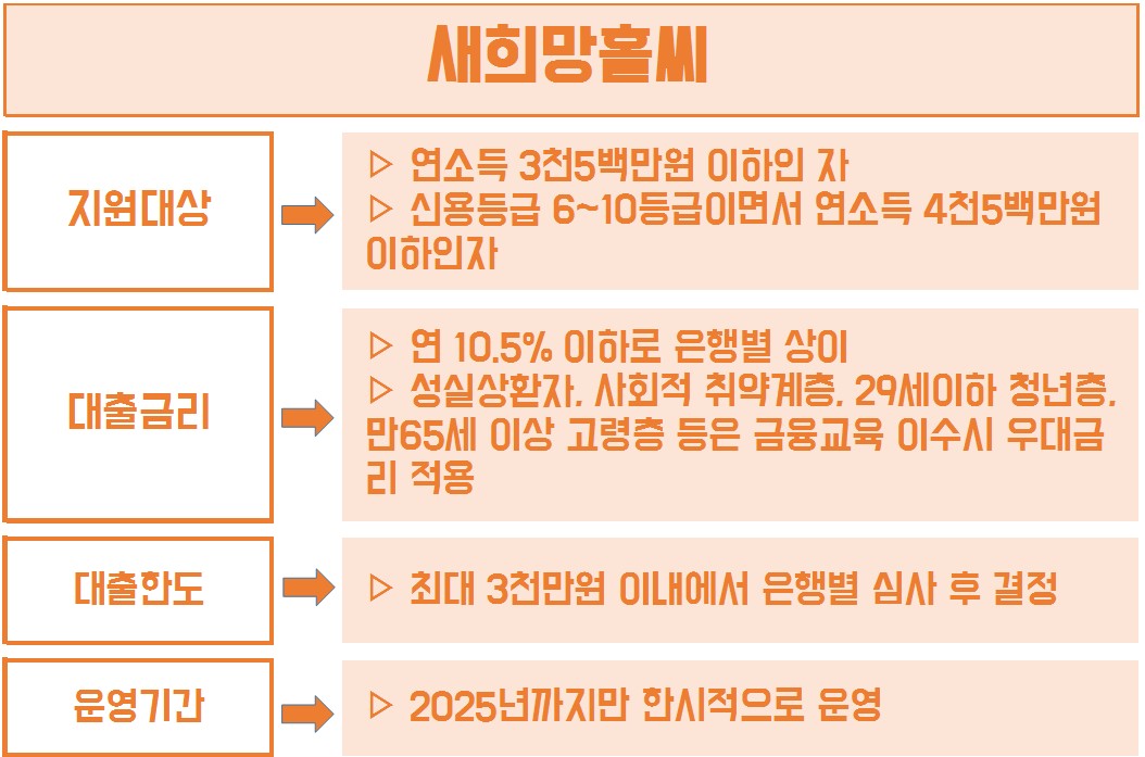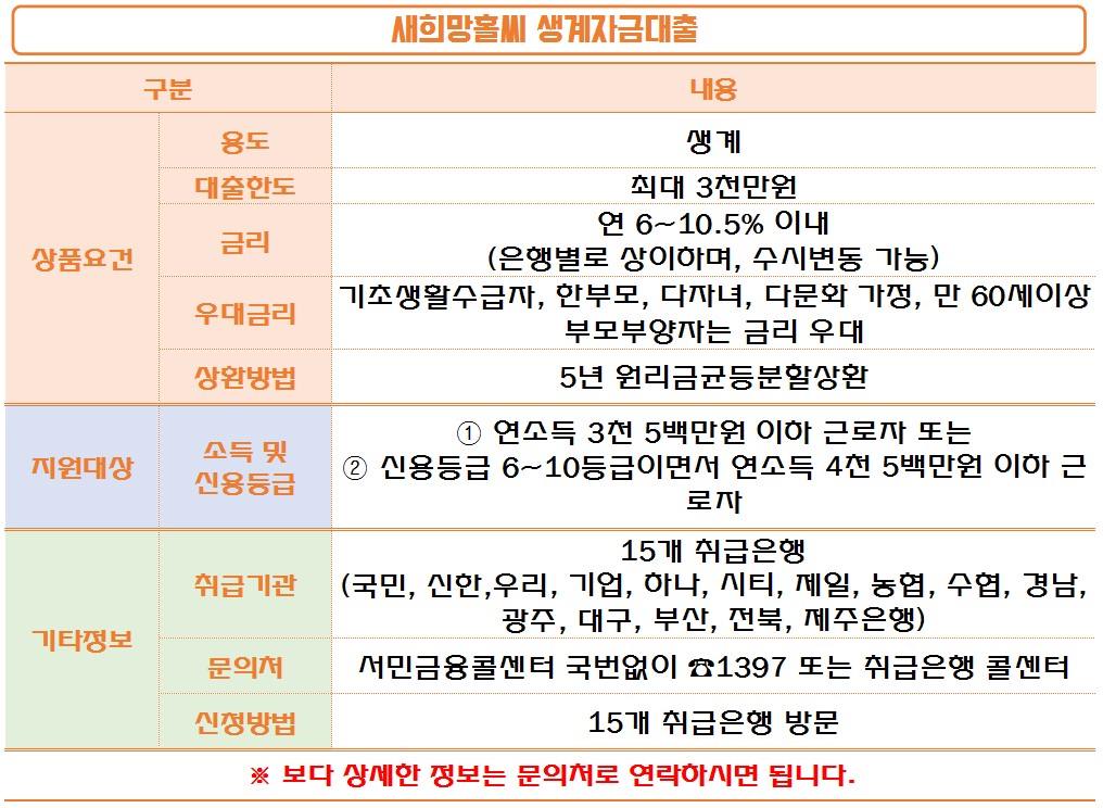 대출한도가 가장 높은 편으로 최대 3천만원까지 가능하지만 은행별 심사 후 결정이 된다고 합니다. 새희망홀씨 대출은 2025년까지만 한시적으로 운영되는 저신용자 직장인 대출상품입니다.
