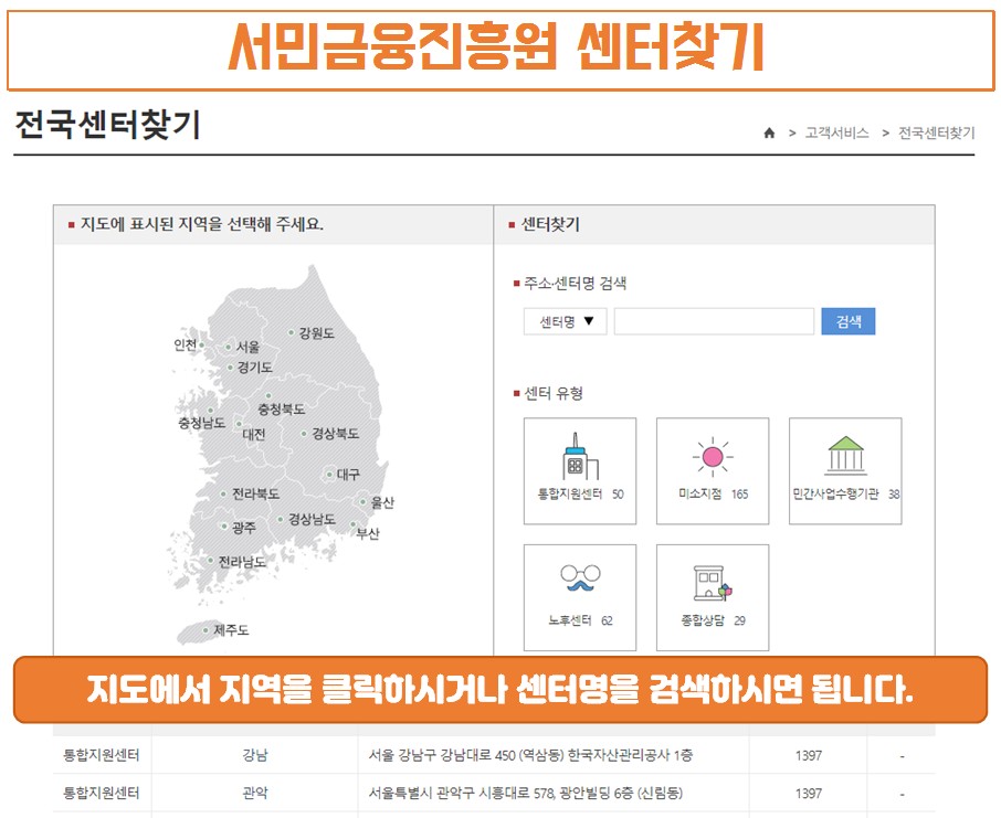 미소금융 지역별 센처 찾기를 클릭하시면 위와 같은 화면을 보실 수 있으며 신청자분의 지역에서 가까운 미소금융지점을 선택하신 후 전화로 방문예약을 하시면 됩니다.