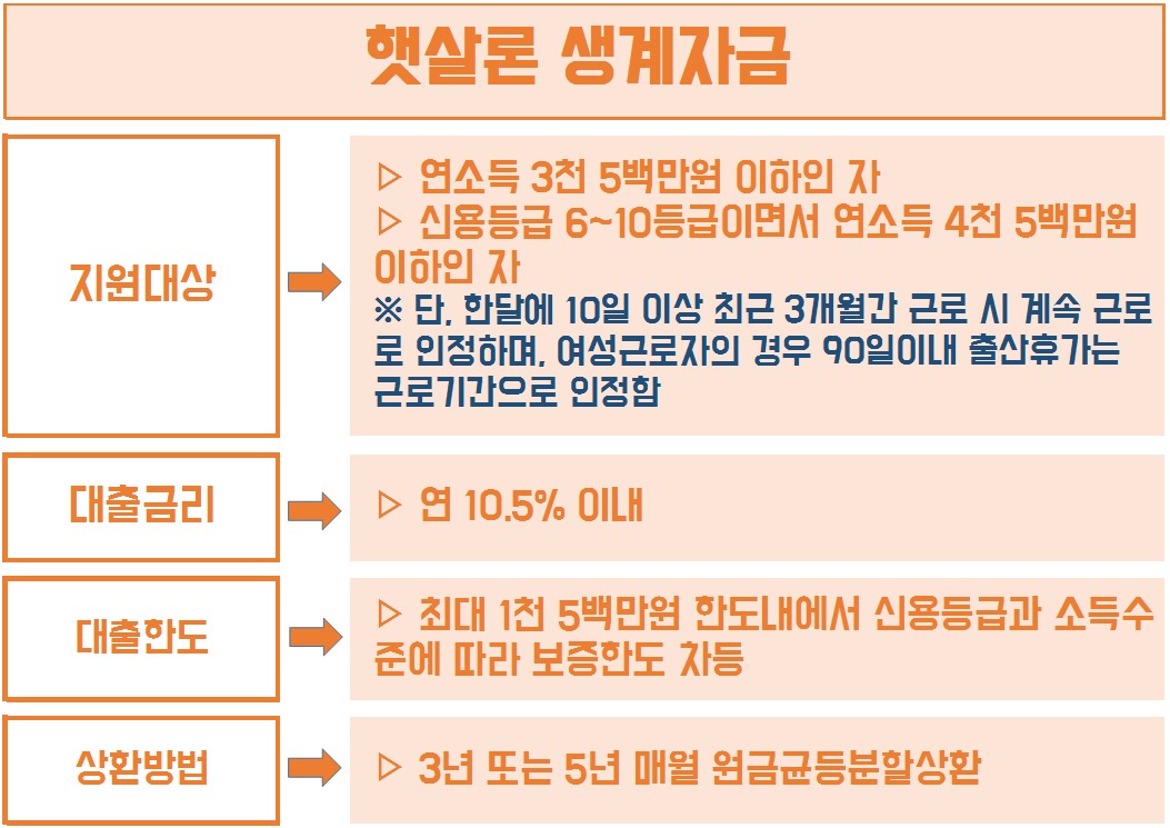 햇살론 생계자금 대출은 신용등급이 6등급에서 10등급 사이이신 직장인 분들에게 지원되는 대출 상품입니다. 연소득은 3천5백만원 이하인 분들은 신용등급에 관계없이 지원이 가능하며, 신용등급이 낮으신 분들은 연소득이 4천5백만원 이하여야 합니다.