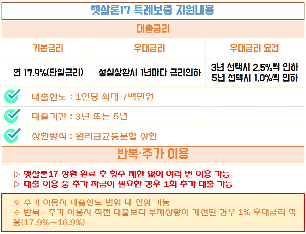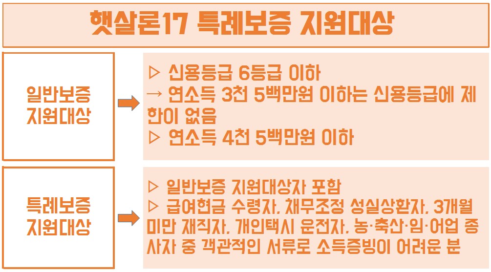 햇살론17은 정부지원 대출의 사각지대에 놓인 급여현금 수령자, 채무조정 성실상환자, 개인택시 운전자 등 소득증빙이 어렵거나 1, 2금융권 대출이 어려운 분들도 빠짐없이 지원하게 됩니다.