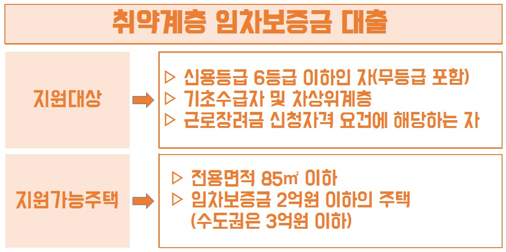 지원대상은 금융취약계층을 대상으로 진행이 되며, 지원가능주택은 전용면적 85㎡ 이하여야 합니다. 임차보증금 역시 수도권은 3억원 이하, 그 외 지역은 2억원 이하의 주택이어야 합니다.