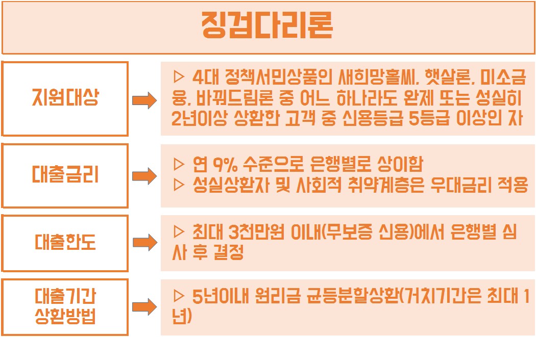 징검다리론은 4대 정책서민대출 상품을 이용하셨던 직장인분들을 대상으로 진행이 되는 대출상품입니다. 햇살론, 새희망홀씨, 미소금융, 바꿔드림론 중 하나라도 완제 또는 2년 이상 성실히 상환한 분들 중 신용등급이 5등급 이상이어야 합니다.