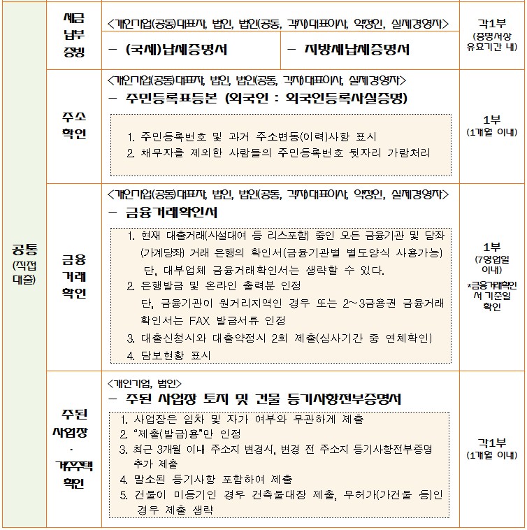 대출 신청시 필요한 서류는 위와 같습니다. 많아보이지만 전부 제출하시는 것이 아니라 업체에 해당하는 서류만 준비하시면 됩니다. 글씨가 잘 안보이실 경우 이미지를 다운로드 받아 확대해서 보시는 것을 추천드립니다.
