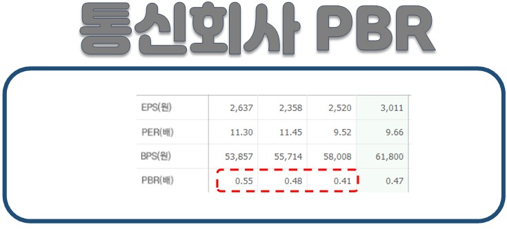 위의 표는 한 통신회사의 2018, 2019, 2020년도 PBR수치입니다. PBR이 0.5정도로 해당 기업을 청산해도 남는 금액이 현재 시가 총액보다 높다는 것을 의미합니다. 하지만 PER은 10배 정도를 유지하고 있습니다. KOSPI 10년 평균치를 선회하고 있으니 PER은 높다고 할 수 없는 수치입니다.
