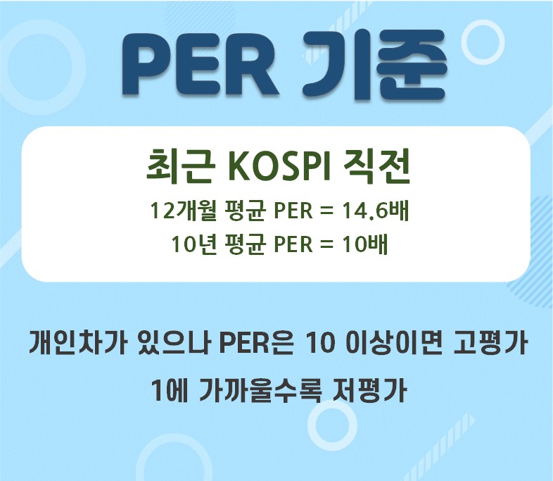KOSPI 최근 12개월 평균 PER은 14.6배 이며, 10년 평균 PER은 10배 입니다. 개인마다 기준을 두는 차이가 있으나 현재 투자하고자 하는 기업의 PER이 10이상이면 고평가되어 있다고 판단하며, 1에 가까울수록 저평가 되었다는 것을 의미합니다.