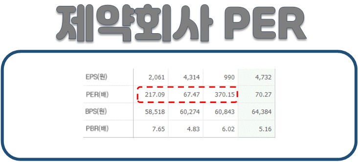 제약회사나 바이오주의 경우 PER이 상대적으로 엄청 높다는 것을 보실 수 있습니다. 모든 제약회사나 바이오주가 그렇지는 않지만 대체로 PER은 일반 기업들에 비해 수치상 높게 나옵니다. 이유는 업종의 특성상 신약 개발과정에서 임상단계 발표에 대한 기대감이 반영되었기 때문입니다.